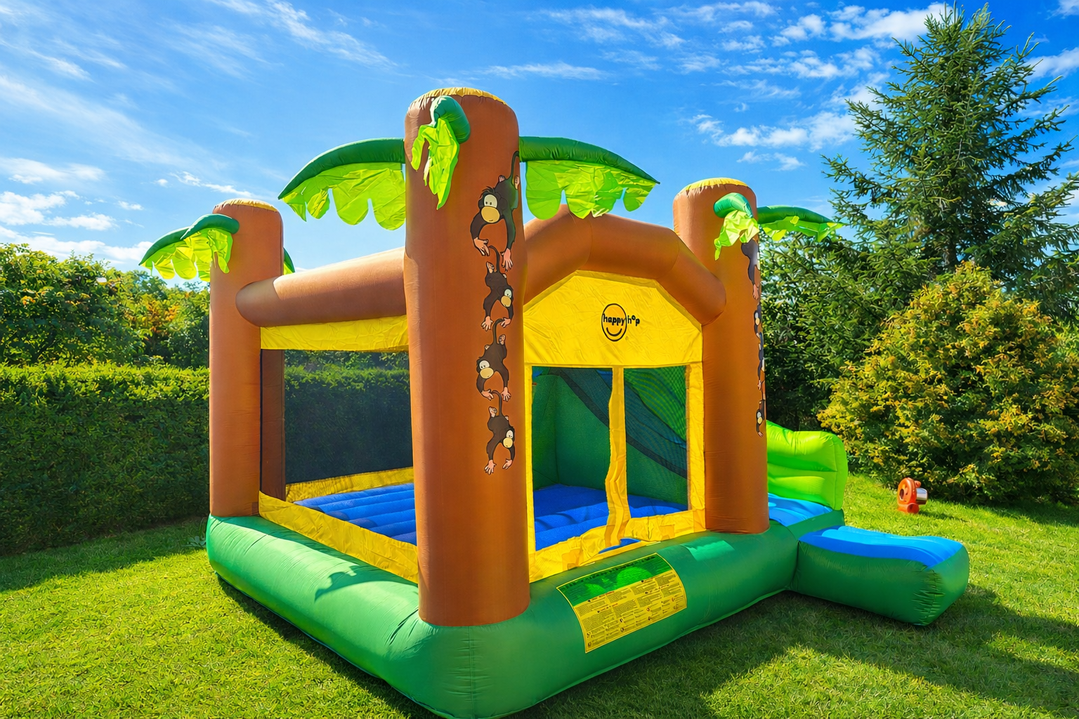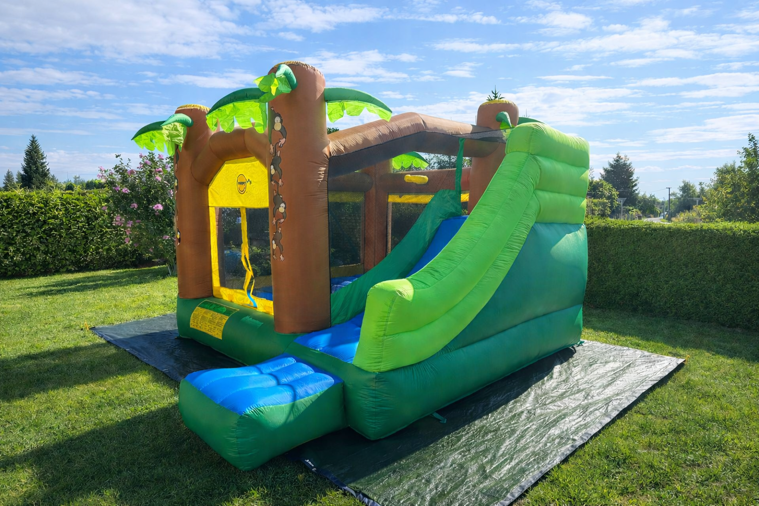 Džungle plná zábavy – skákací hrad s plochou na dovádění, skluzavkou i basketbalovým košem nadchne malé dobrodruhy na první pohled.